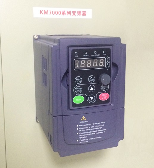KM7000系列三相380V帶(定位旋鈕)矢量變頻器(以下簡稱KM7000系列矢量變頻器)是應用無感矢量(Serlsor-Less vector)技術,控制輸出電壓和頻率來改變交流電機運轉速度的一種電力轉化器,僅靠電流傳感器,精確偵測出三相輸出交流電力信號及相應角度的變化,以無感矢量(Serlsor-Less vector)計算方式,自動修正頻率,已達到負載變動時電機轉速固定之效果。相對于傳統的V/F控制變頻器,KM7000系列矢量變頻器不僅于電機低速運轉時提供更大的轉矩,而且可自動補償高負載時電機的轉速變動。